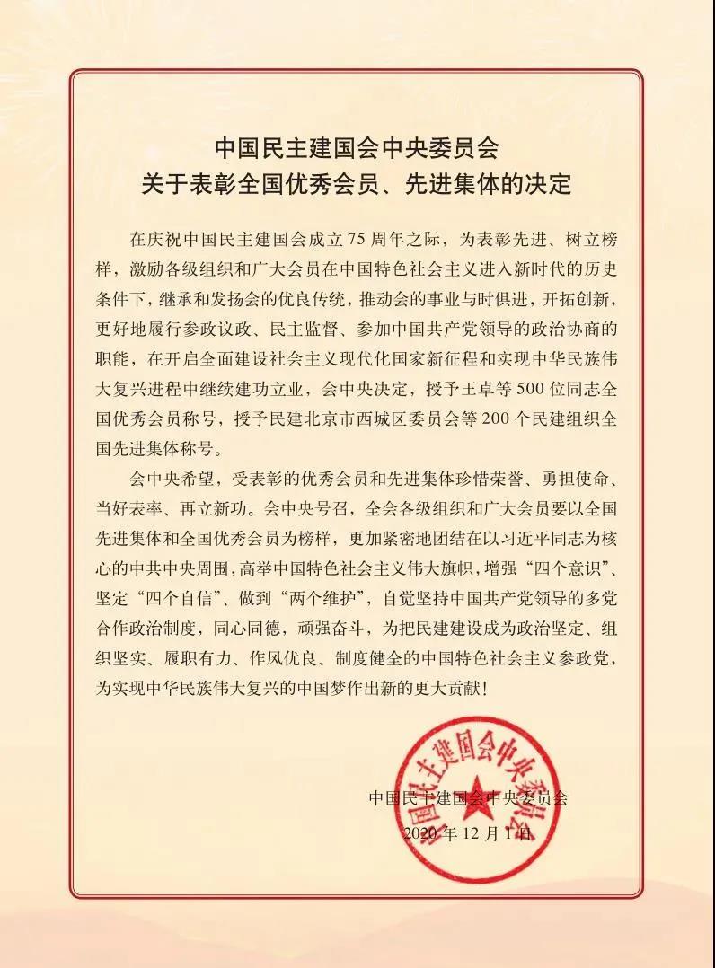 12月1日,民建成立75周年全國優(yōu)秀會員和先進集體暨抗擊新冠肺炎疫情先進個人和先進集體表彰大會在北京隆重舉行。